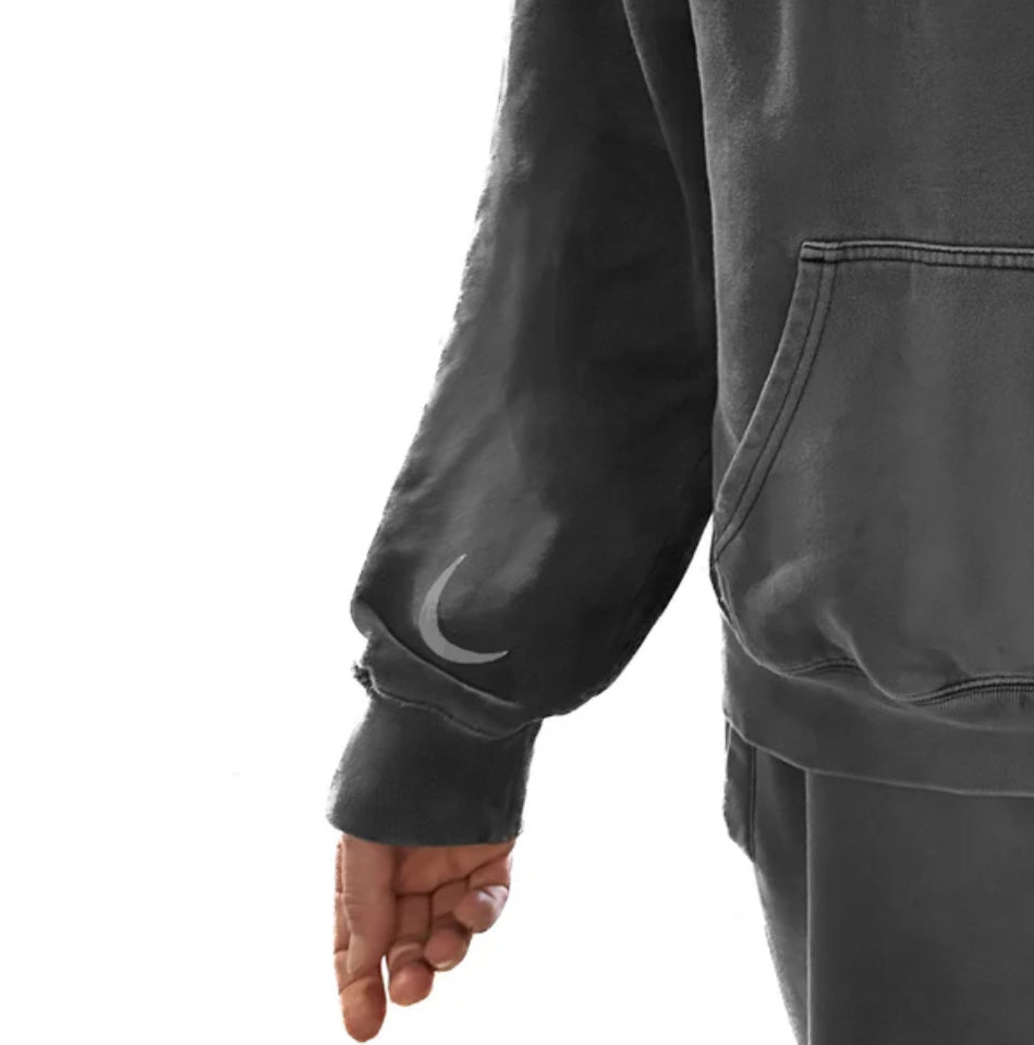 Printed locally in the Hudson Valley, a mid weight faded black 9.4oz, 80% cotton 20% recycled polyester fleece, has been pre shrunk, features a self-fabric lined pullover hood, drop shoulder, kangaroo pocket, and no drawcord for a seamless look
